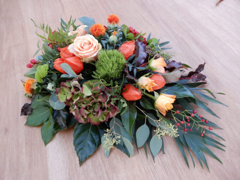 Druppelvormig rouwstuk in herfstkleuren. Het afgebeelde rouwstuk (standaard) heeft een doorsnede van ongeveer 50 cm.